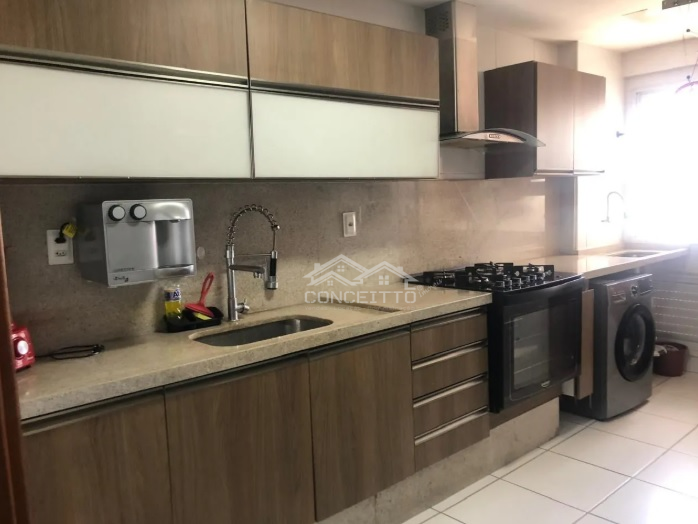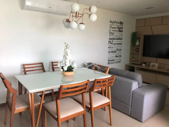 Apartamento com 3/4 sendo 1 suíte, varanda gourmet com armários e rede de proteção, piso em porcelanato, sala ampla climatizada e com painel, cozinha com móveis planejados modernos e funcionais, suíte e quartos com arcondicionado e móveis sob medida. Banheiros com lindas bancadas e armários. 2 vagas de garagem soltas e descobertas.