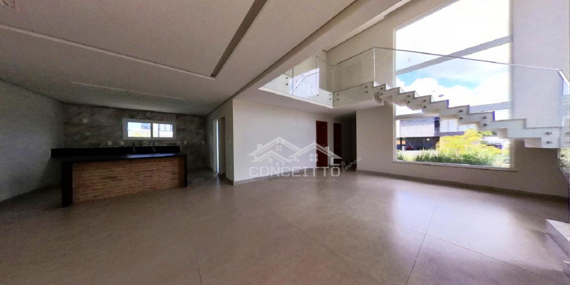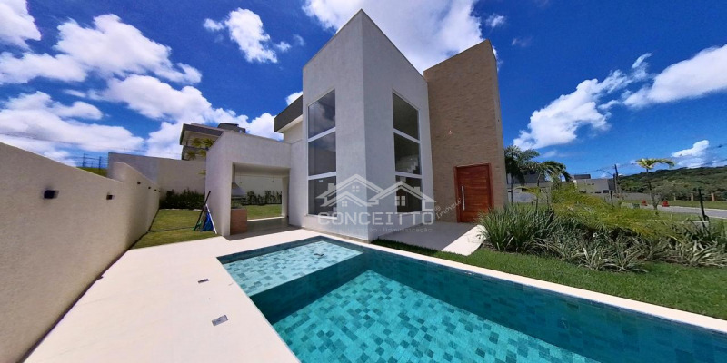 Casa nova, recém construída com 4 suítes, sendo 1 suíte no pavimento térreo, Condomínio Alphaville III. Imóvel com piso em porcelanato, sala ampla com pé direito alto, cozinha conjugada, 4 suítes, lavabo, quintal com área verde, espaço gourmet com lavabo, piscina adulto/infantil.