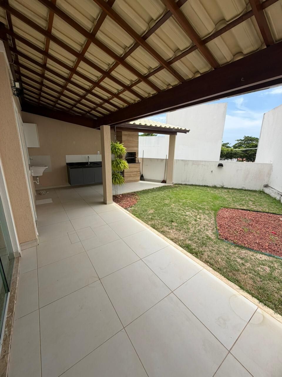 Casa nova com 3 suítes, todas com armários planejados, todos os banheiros com espelho, box, sala para dois ambientes, cozinha com bancada de granito, armários, piso em porcelanato, área de serviço coberta, área gourmet com churrasqueira coberta e uma área descoberta com grama, duas vagas de garagem sendo uma coberta e outra descoberta. Condomínio com portão eletrônico, piscina, churrasqueira.